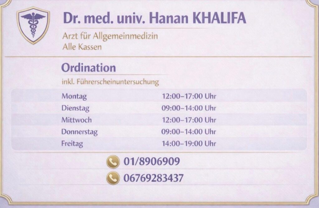 Die Ordination von Dr. Hanan Khalifa befindet sich im Zentrum Wiens und bietet ein breites Spektrum an allgemeinmedizinischen Leistungen sowie ausgewählte ästhetische Behandlungen.